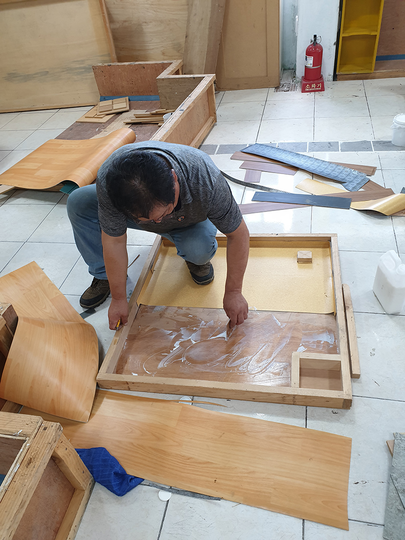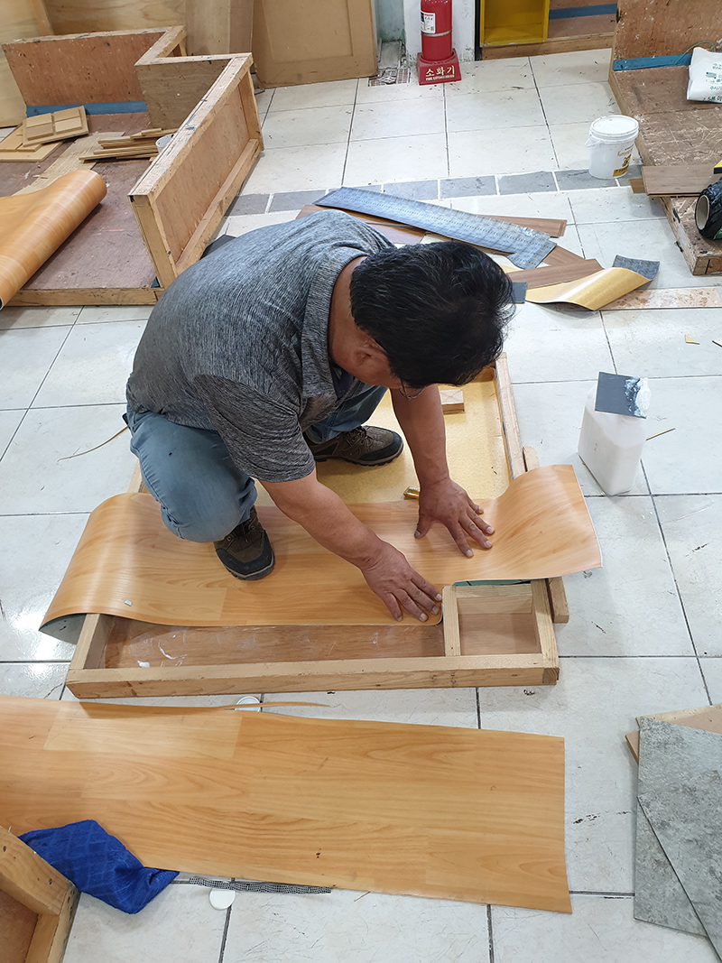 접착제 도포 후 룸장판 설치 및 기포 제거